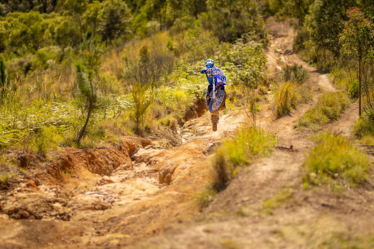 Vive la WR250F en acción: rodando en senderos, saltos, curvas exigentes, postura del piloto, respuesta del motor y estabilidad en superficies irregulares.